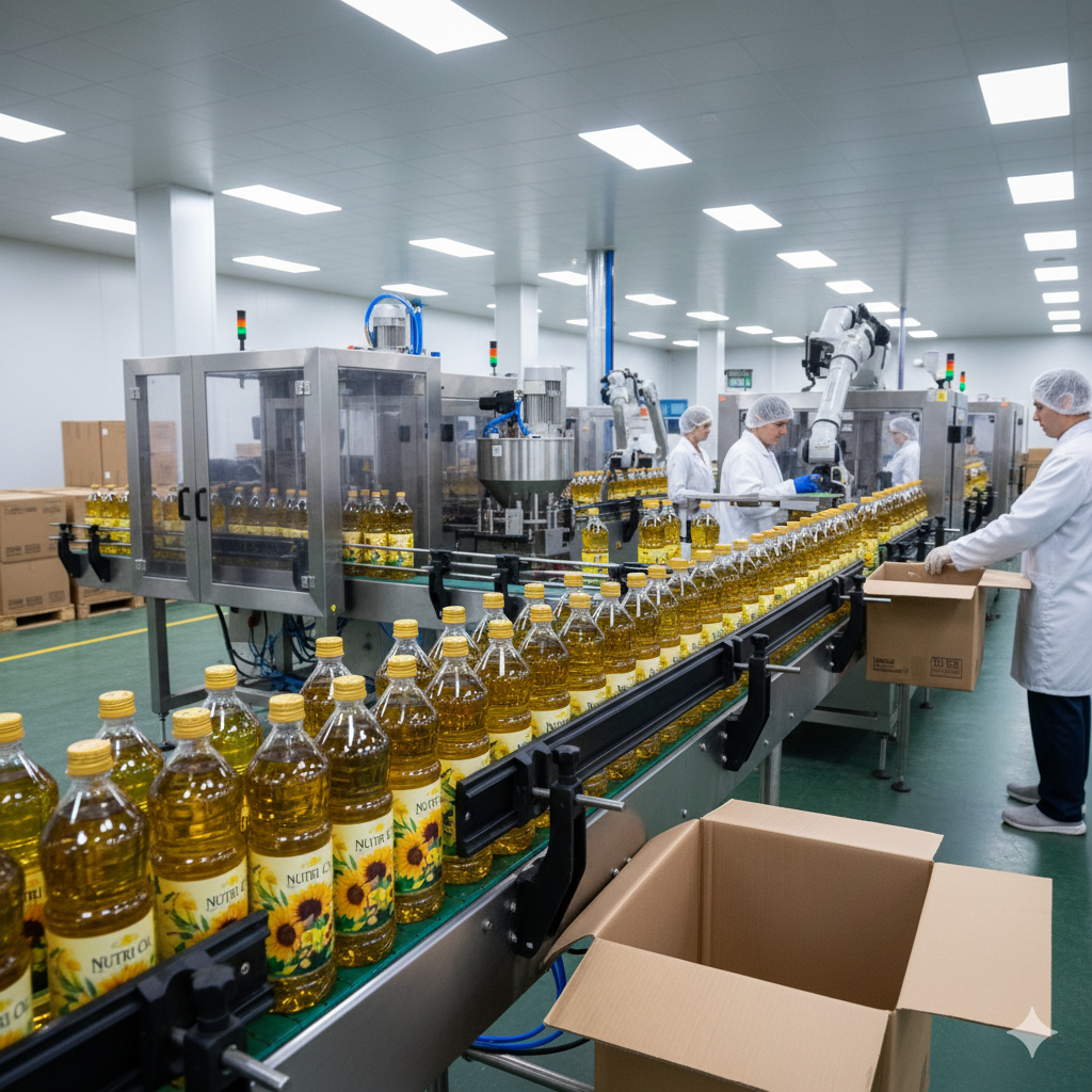 الزيوت النباتية: صناعة زيوت المائدة بأنواعها (زيت دوار الشمس، زيت نباتي، زيت زيتون) بعبارة على النقاء والفوائد الصحية.